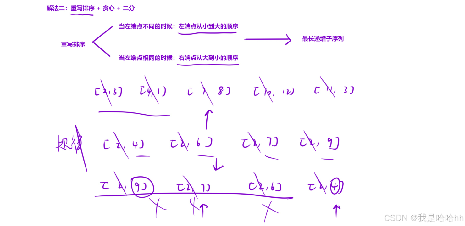 i. 左端点不同的时候:按照「左端点从⼩到⼤」排序;ii. 左端点相同的时候:按照「右端点从⼤到⼩」排序