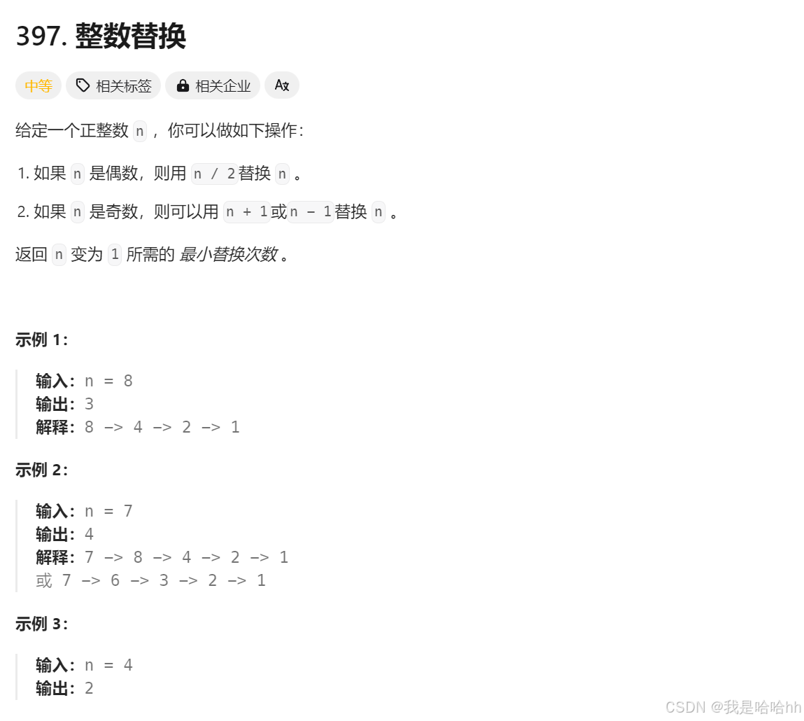 i. 当 n== 1 的时候,不⽤执⾏任何操作;ii. 当 n == 3 的时候,变成 1 的最优操作数是 2 ;iii. 当 n > 1 && n % 3 == 1 的时候,那么它的⼆进制表⽰是 ......01 ,最优的⽅式应该选择 -1 ,这样就可以把末尾的 1 ⼲掉,接下来执⾏除法操作,能够更快的变成 1 ;iv. 当 n > 3 && n % 3 == 3 的时候,那么它的⼆进制表⽰是 ......11 ,此时最优的策略应该是 +1 ,这样可以把⼀堆连续的 1 转换成 0 ,更快的变成 1 。