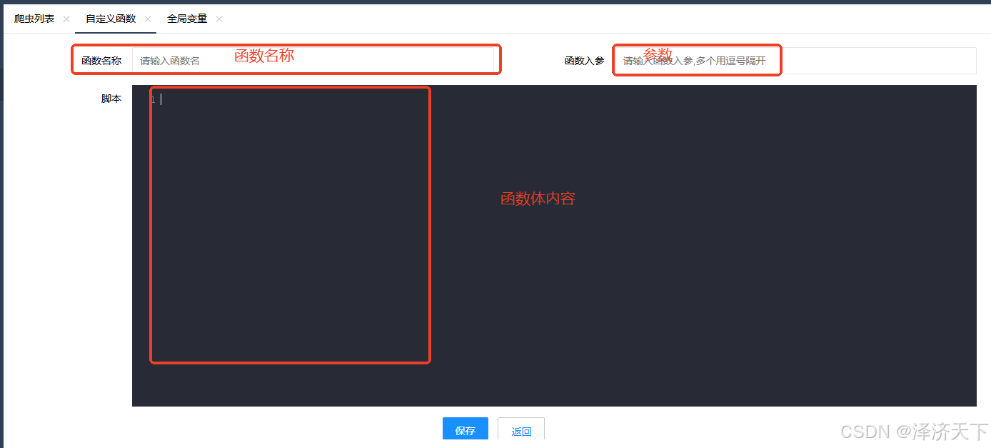 非常清晰,函数名称、参数、函数体。这里的函数体使用js语法,支持function调用。