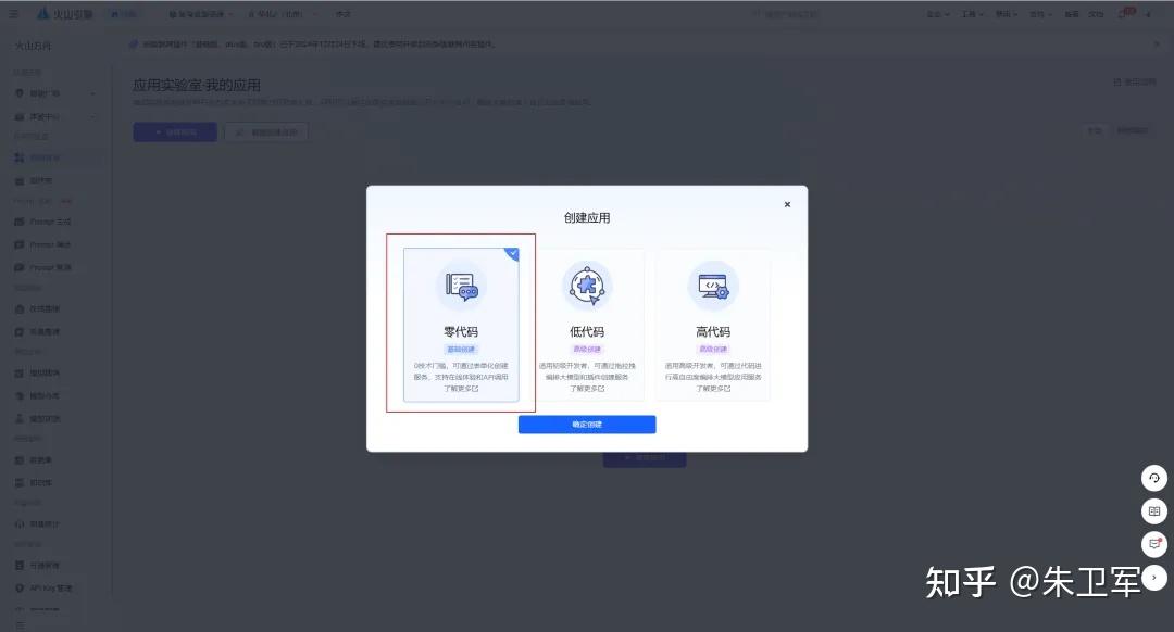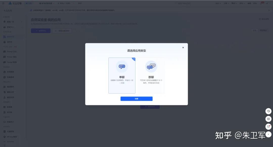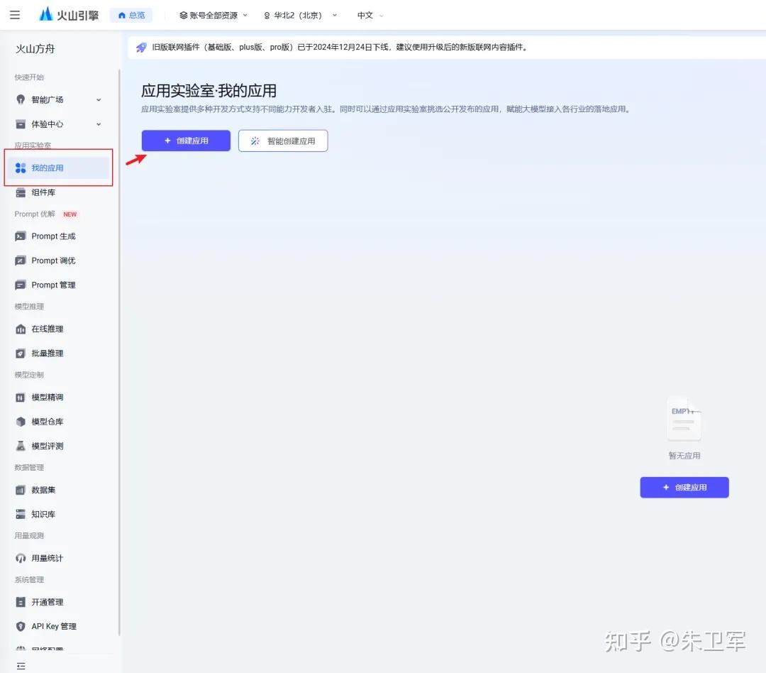 准备好推理接入点和API Key后,接下来我们在左侧菜单中的我的应用里创建具有联网搜索功能的应用: