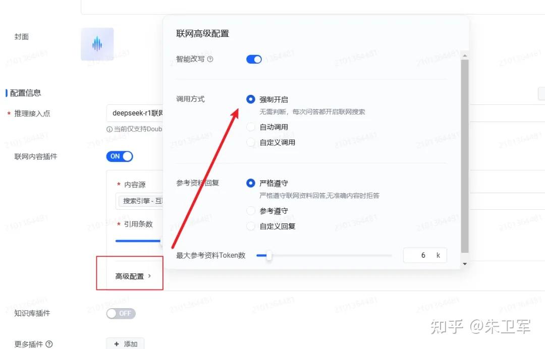 其中建议在联网内容插件的高级配置中,选择调用方式为「强制开启」,以确保问答过程尽可能的引用互联网内容: