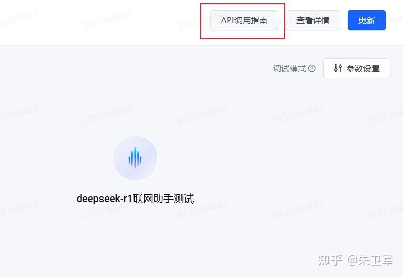 接着点击右上角的发布按钮完成创建,这时就可以点击右上角的API调用指南查看如何通过代码的方式,来调用上面创建好的联网问答服务: