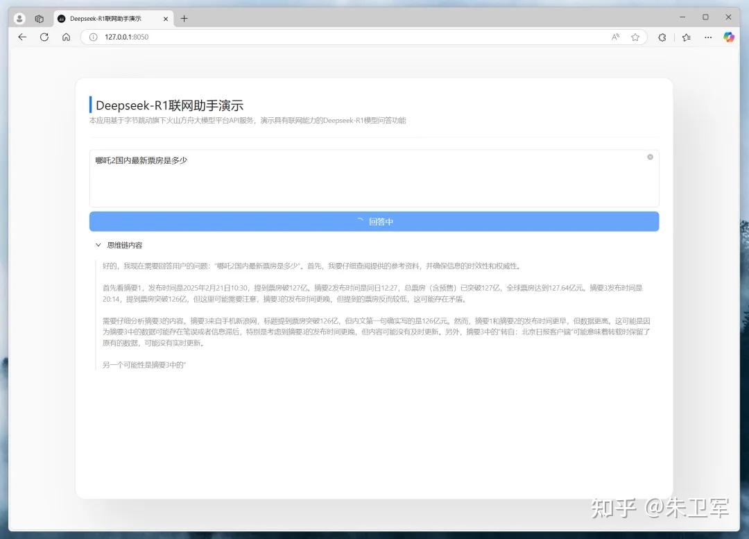 这里以字节跳动旗下的火山方舟大模型平台为例,展示如何纯Python开发一个具有联网搜索功能的deepseek在线问答助手应用,下面是该应用的功能演示: