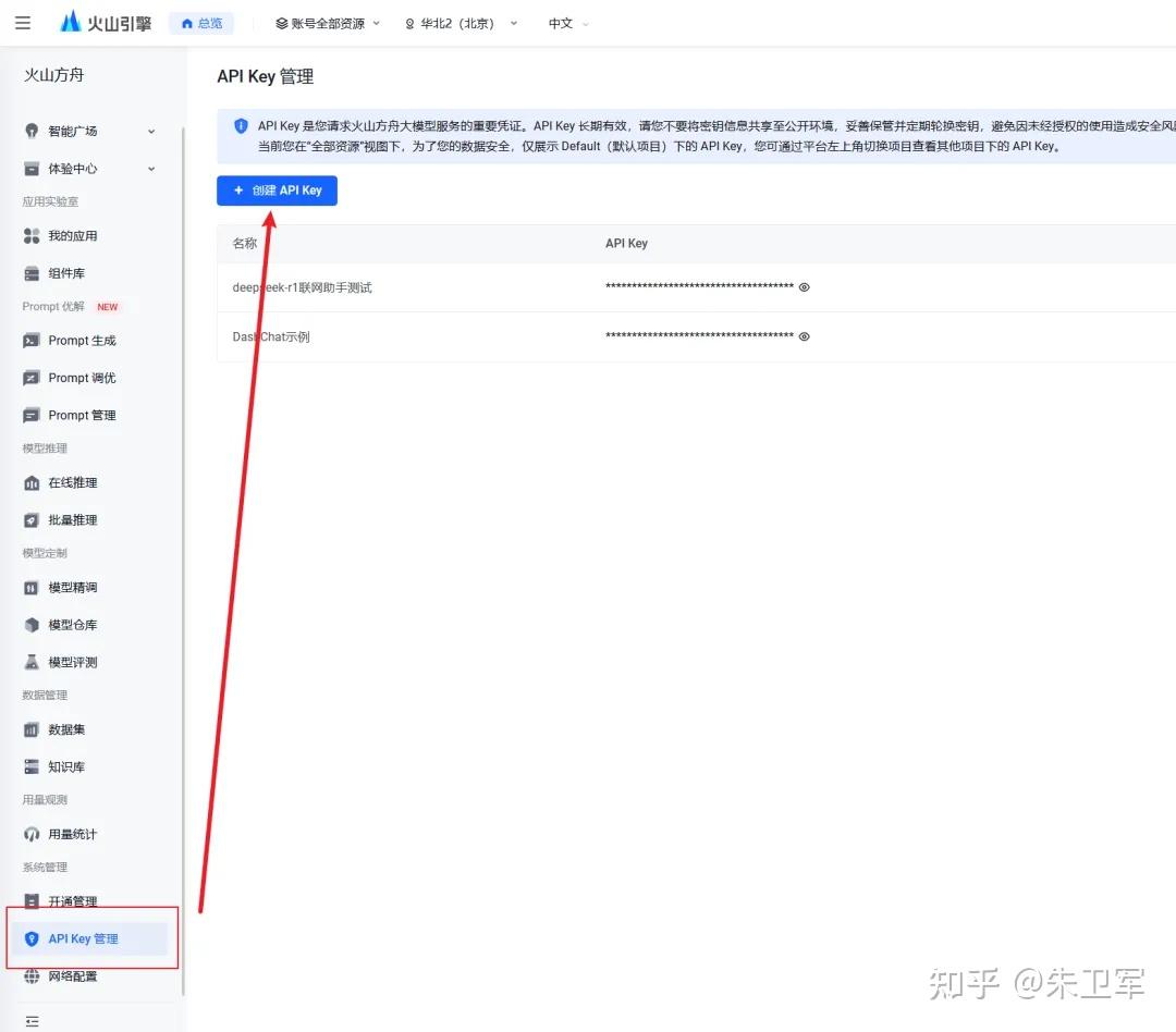 接着进入左侧菜单中的API Key管理页面,按提示完成API Key的创建,这是我们在代码中进行服务调用时的凭据参数: