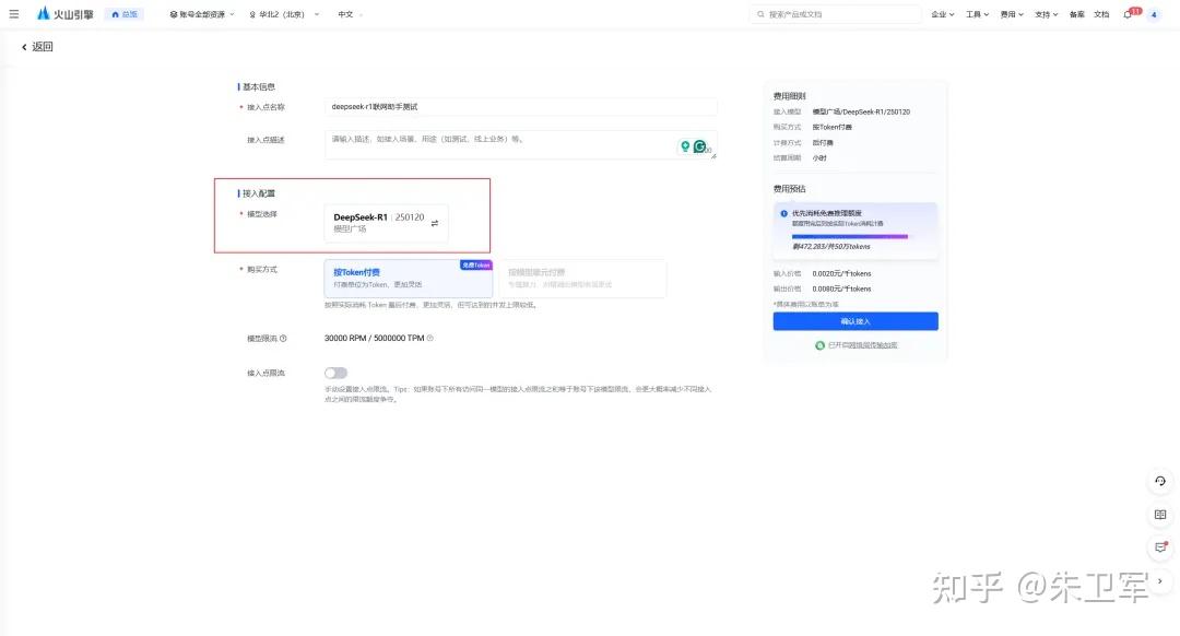 选择我们需要的deepseek-r1模型后,点击右侧的确认接入完成接入点的创建: