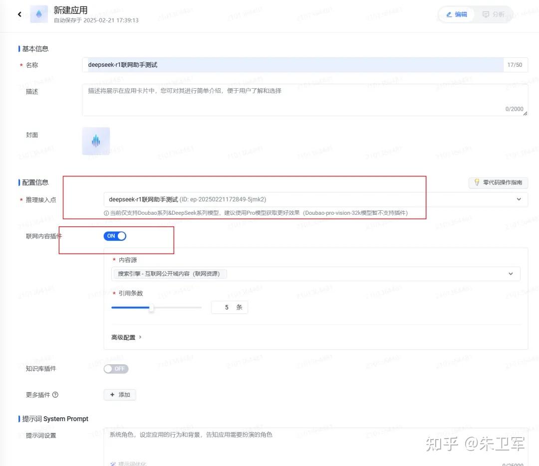 接着参考下面的例子,配置好对应的推理接入点,并勾选开启联网内容插件功能: