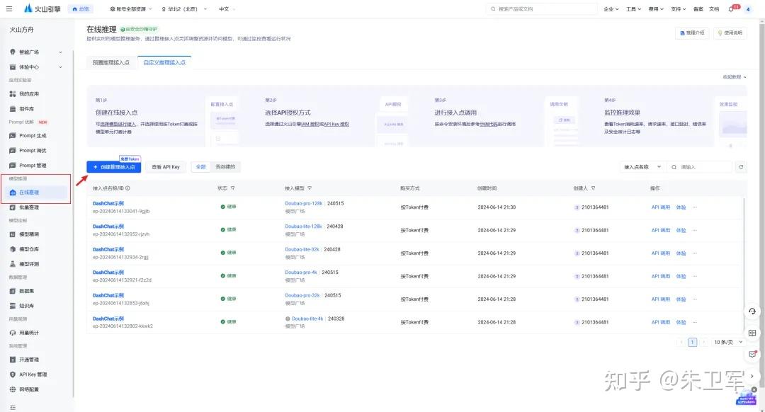 点击左侧菜单中的在线推理,点击创建推理接入点按钮: