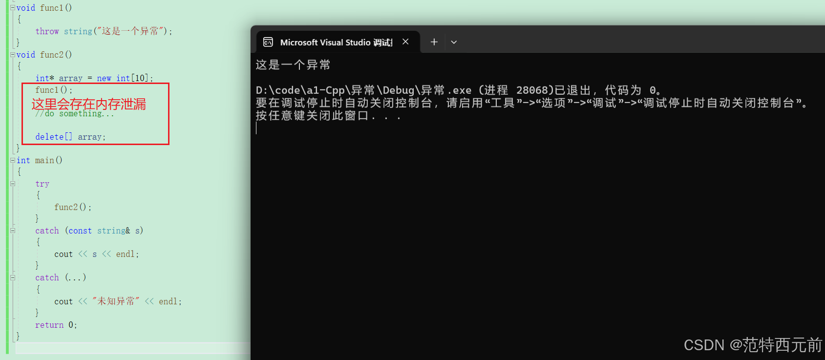 void func1() {throw string("这是一个异常"); } void func2() {int* array = new int[10];func1();//do something...delete[] array; } int main() {try{func2();}catch (const string& s){cout << s << endl;}catch (...){cout << "未知异常" << endl;}return 0; }结果如下: