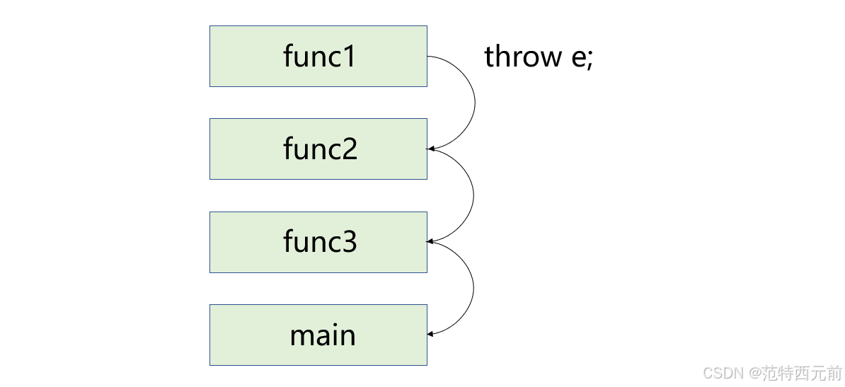 - 首先会检查throw本身是否在try块内部,这里由于throw不在try块内部,因此会退出func1所在的函数栈,继续在上一个调用函数栈中进行查找,即func2所在的函数栈。