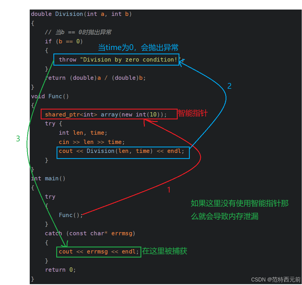 在异常体系中最好使用RAII思想申请资源即使抛出异常后直接跳到catch也没问题当出了对象作用域会自动调用析构释放!4、【异常规范】
