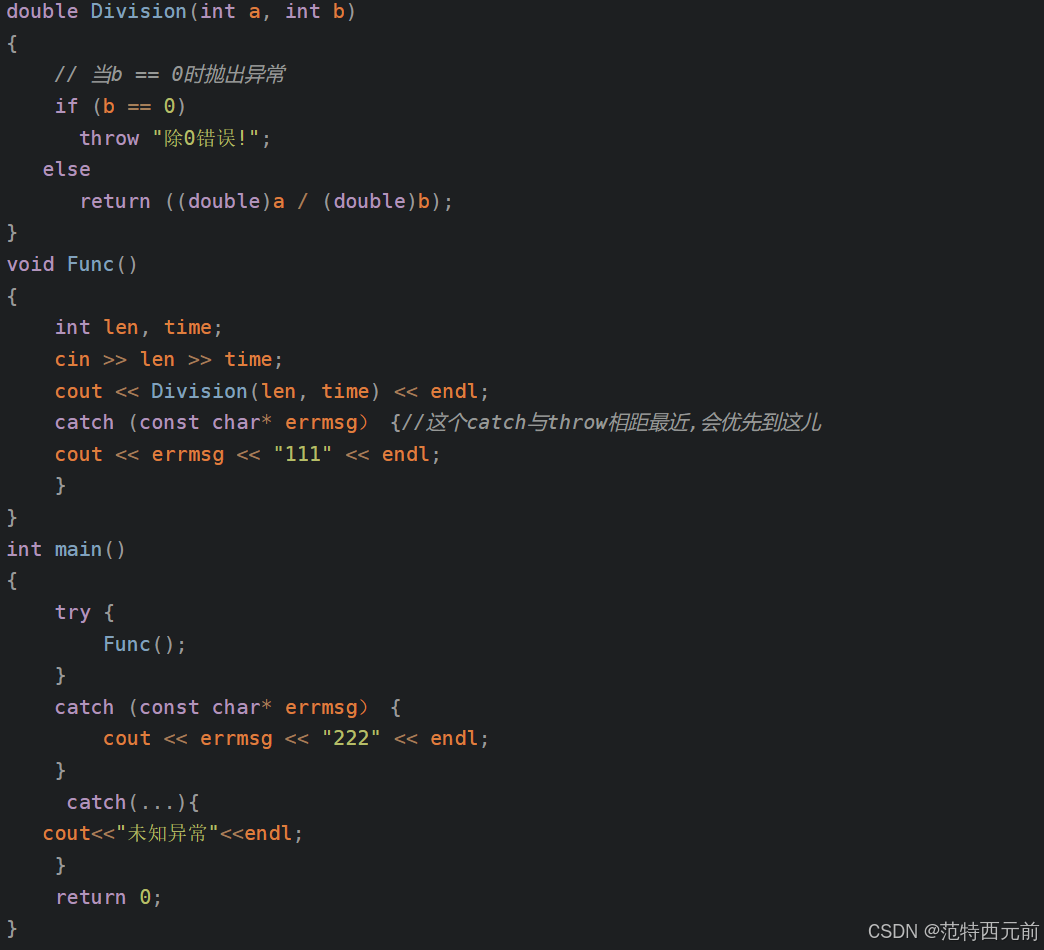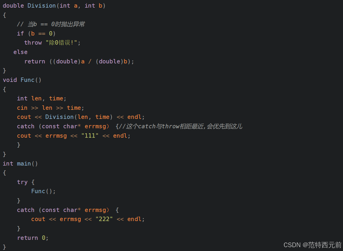 那么这个抛出的异常就不会去这个catch。throw和catch遵循就近原则,被选中的处理代码(catch块)是调用链中与该对象类型匹配且离抛出异常位置最近的那一个。- 抛出异常对象后,会生成一个异常对象的拷贝,因为抛出的异常对象可能是一个临时对象,所以会生成一个拷贝对象,这个拷贝的临时对象会在被catch以后销毁。(类似于函数的传值返回)