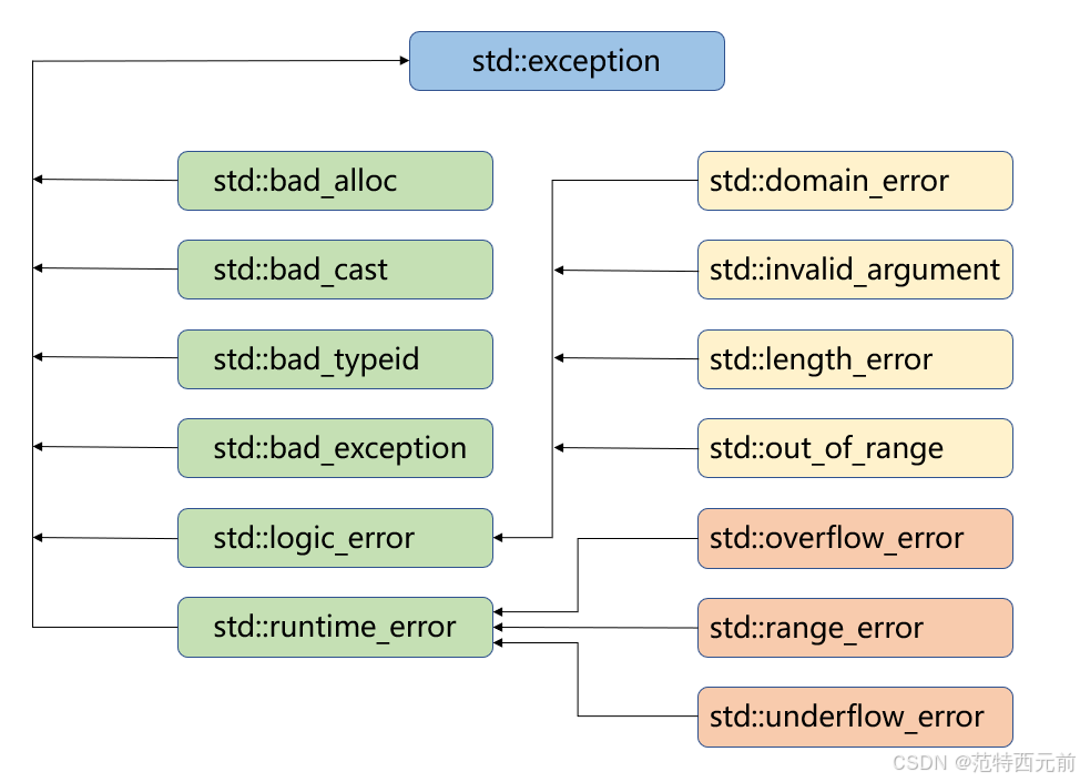 C++标准库当中的异常也是一个基础体系,其中exception就是各个异常类的基类,我们可以在程序中使用这些标准的异常,它们之间的继承关系如下: