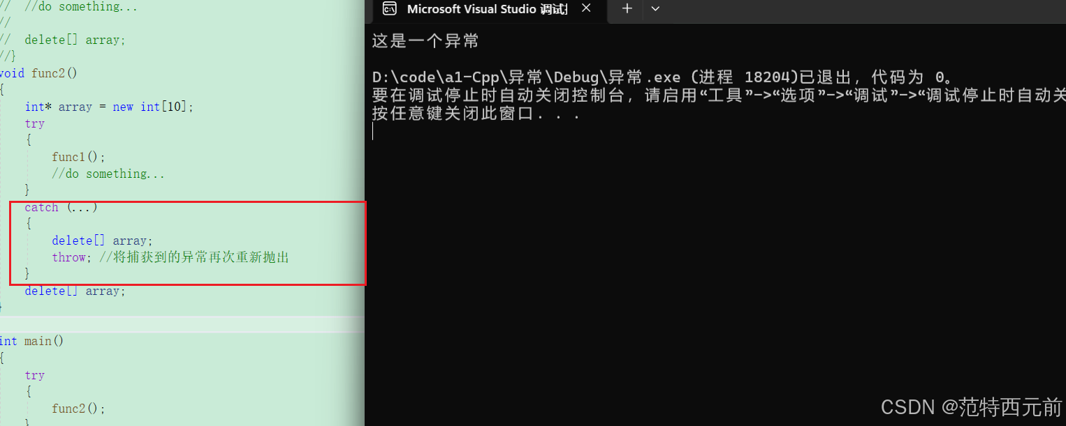 void func2() {int* array = new int[10];try{func1();//do something...}catch (...){delete[] array;throw; //将捕获到的异常再次重新抛出}delete[] array; }结果如下: