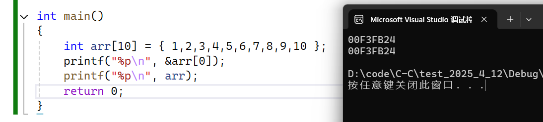 这里我们使用arr的方式拿到了数组第一个元素的地址,有些人可能会有疑惑?不应该&arr[0]才是数组第一个元素的地址吗,其实,大部分情况这两种写法是一样的意思,并没有含义的不同,我们来做一个测试。