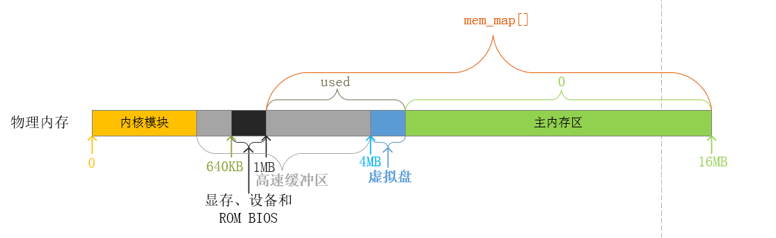 由此可知,系统的物理内存被划分为内核模块,高速缓冲区,虚拟盘,主内存区四大部分。以拥有 16MB 的物理内存的系统为例,下图展示了其物理内存的功能划分: