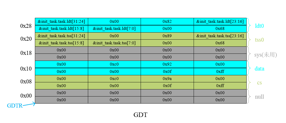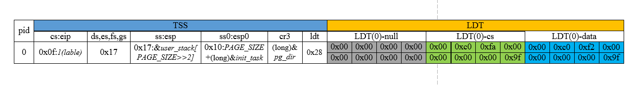 需要做的就是将任务 0 的 PCB 即 init_task.task 中的 TSS 和 LDT 的基地址,段限长和属性信息填入到 GDT 表中对应的用来存放任务 0 的 TSS 描述符和 LDT 描述符的描述符表项中。这个工作是在 sched_init() 函数中完成的,通过执行 set_tss_desc(gdt+FIRST_TSS_ENTRY,&(init_task.task.tss)) 宏函数来设置 GDT 表中任务 0 的 TSS 描述符表项,通过执行 set_ldt_desc(gdt+FIRST_LDT_ENTRY,&(init_task.task.ldt)) 宏函数来设置 GDT 表中的任务 0 的 LDT 描述符表项。此时,GDT 表的字节分布如下图所示: