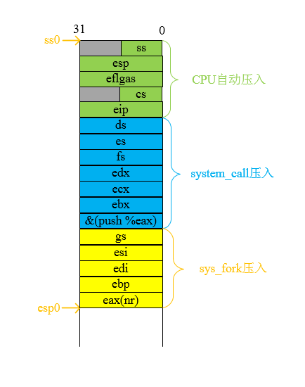 其中 &(push %eax) 是 system_call 调用 sys_fork 返回后紧接着要执行的指令地址。