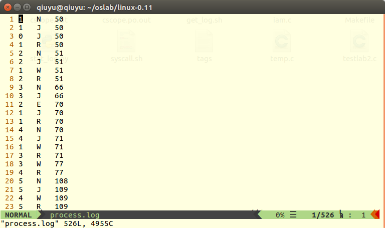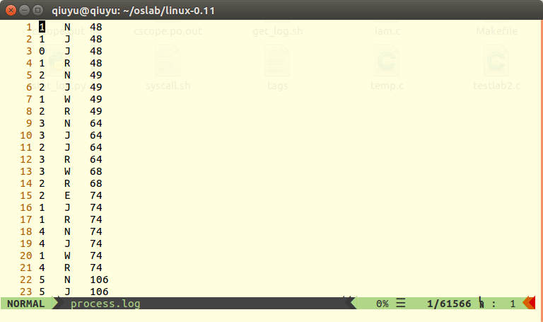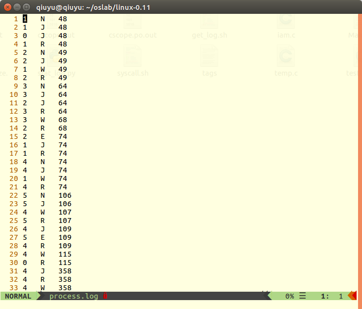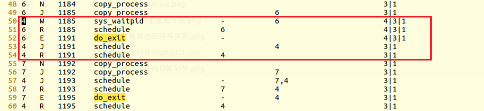 正如上面所提到的,当系统无事可做时(当前没有可以运行的进程)时就会调度进程 0 执行,所以schedule调度算法不会在意进程 0 的状态是不是就绪态(TASK_RUNNING),进程 0 可以直接从睡眠切换到运行。而进程 0 会马上调用pause()API 主动睡觉,在最终的内核实现函数sys_pause中又再次调用schedule()函数。也就是说,系统在无事可做时会触发这样一个循环:schedule()调度进程 0 执行,进程 0 调用sys_pause()主动睡觉,从而引发schedule()再次执行,接下来进程 0 又再次执行,循环往复,直到系统中有其他进程可以执行。而这个循环每执行一次的时间很短,所以在系统无事可做时,这个过程将十分频繁地重复,所以如果一五一十地记录下这个循环中进程 0 从睡眠(W)-> 运行(R)-> 睡眠(W)的过程,那么最终生成的 log 文件会因为这一频繁的循环而变得特别庞大,要比不这样记录的 log 文件大小上大上至少 10 倍量级!所以,为了简化 log 文件中这个不必要的重复信息,可以简单地认为在系统无事可做时,进程 0 的状态始终是等待(W),等待有其他可运行的进程;也可以叫运行态(R),因为它是唯一一个在 CPU 上运行的进程,只不过运行的效果是等待,我采用第二种简化。