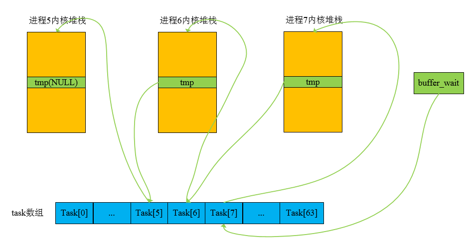 最终的内存中各个进程内核堆栈以及 buffer_wait 变量的内容如下: