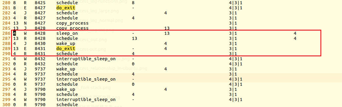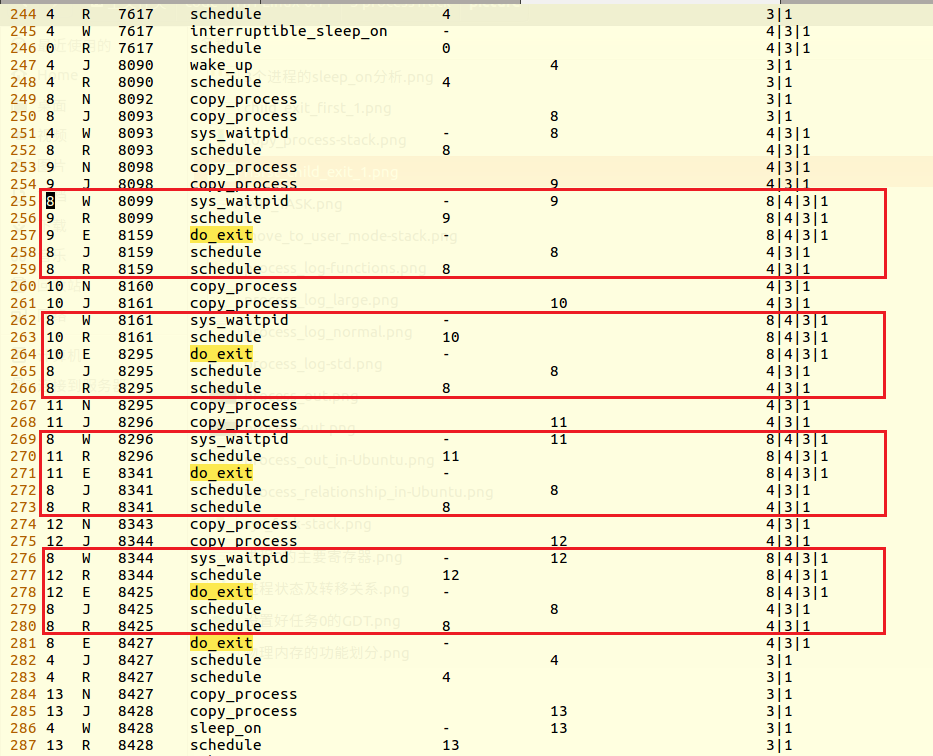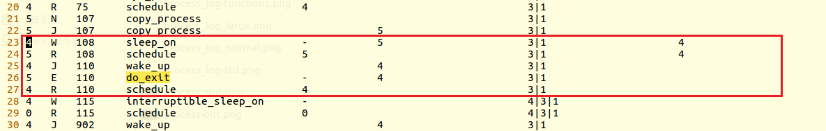 子进程退出的最后一步是通知父进程自己的退出,目的是唤醒正在等待此时间的父进程。从时序上说,应该是子进程先退出,父进程才醒来。下面来看下 log 文件中的一些印证了这个结论的记录: