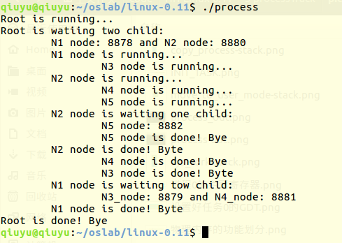 可以看出,在修改过的 Linux 0.11 上运行时,process.c 程序的各个进程对应到具体 pid 的进程关系树如下: