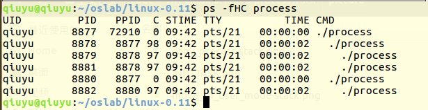 在 process 可执行程序运行的同时,利用ps -fHC process显示运行./process命令过程中各个进程之间的关系和树状结构,其输出如下: