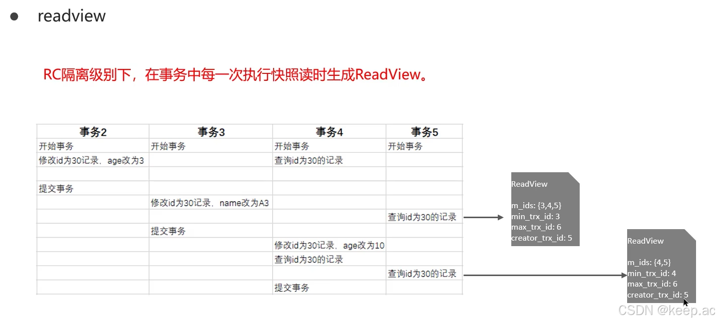 ReadView(读视图)是快照读。是一个事务在执行 快照读(SELECT 等语句) 时生成的,它保存了4个关键字段(3.4.3 有介绍)