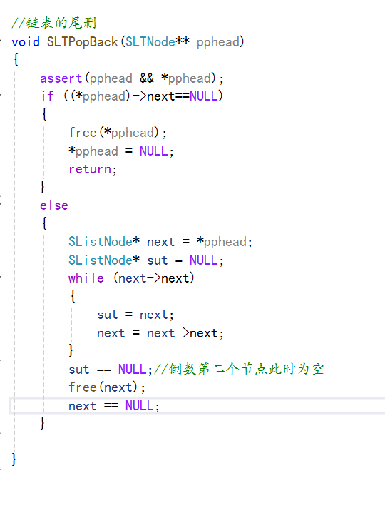 尾删很好理解的,前面我们已经写了尾插了,其也是一样,首先我们要找到尾节点,然后才可以对其进行释放,那么我们就需要进行遍历,找到尾节点,那么我们创建一个指针变量来进行遍历,对其赋值为头节点的地址。然后找到尾节点后,我们对其进行内存释放,然后其前一个节点就成为了尾节点了,那么其指向下一个指针的指针变量也要指向NULL,那么我们再