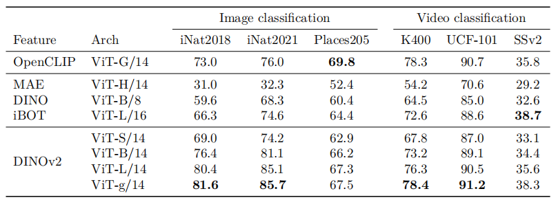 性能优势:DINOv2在ImageNet分类、ADE20K分割、细粒度分类等任务上超越OpenCLIP和iBOT等基线模型,接近监督学习性能。