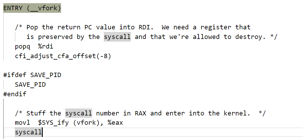 可是为什么我们⽤的系统调⽤,从来没有⻅过什么 int 0x80 或者 syscall 呢?都是直接调⽤上层的函数的啊?那是因为Linux的GNU glibc C标准库,给我们把⼏乎所有的系统调⽤全部封装了。例如下图: