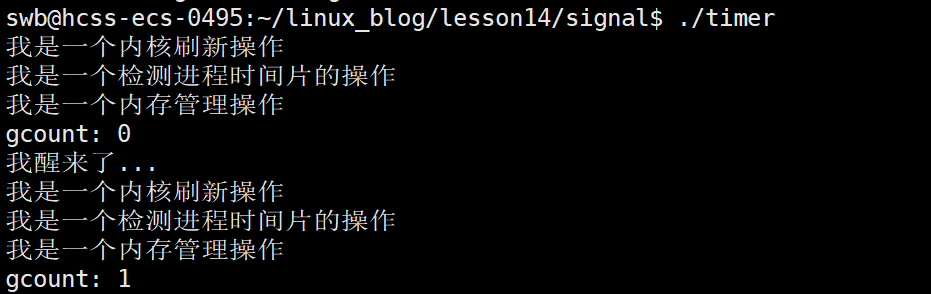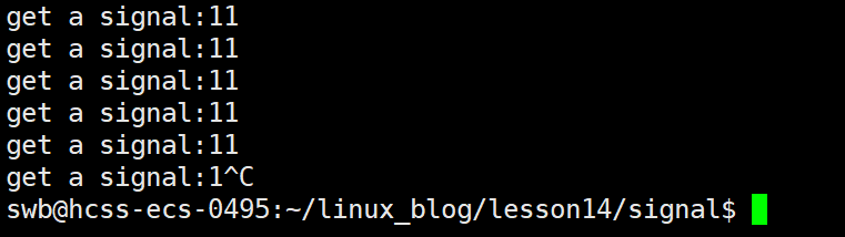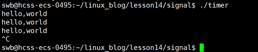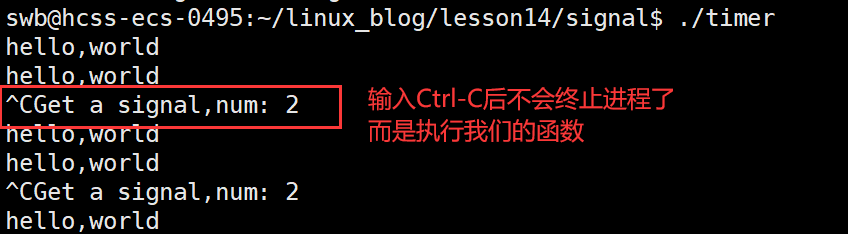{//为2号信号自定义处理动作signal(SIGINT,Handler);while(true){std::cout<<"hello,world"<<std::endl;sleep(1);}return 0;