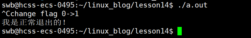 标准情况下,键⼊CTRL-C ,2号信号被捕捉,执⾏⾃定义动作,修改 flag=1 , while 条件不满⾜,退出循环,进程退出。