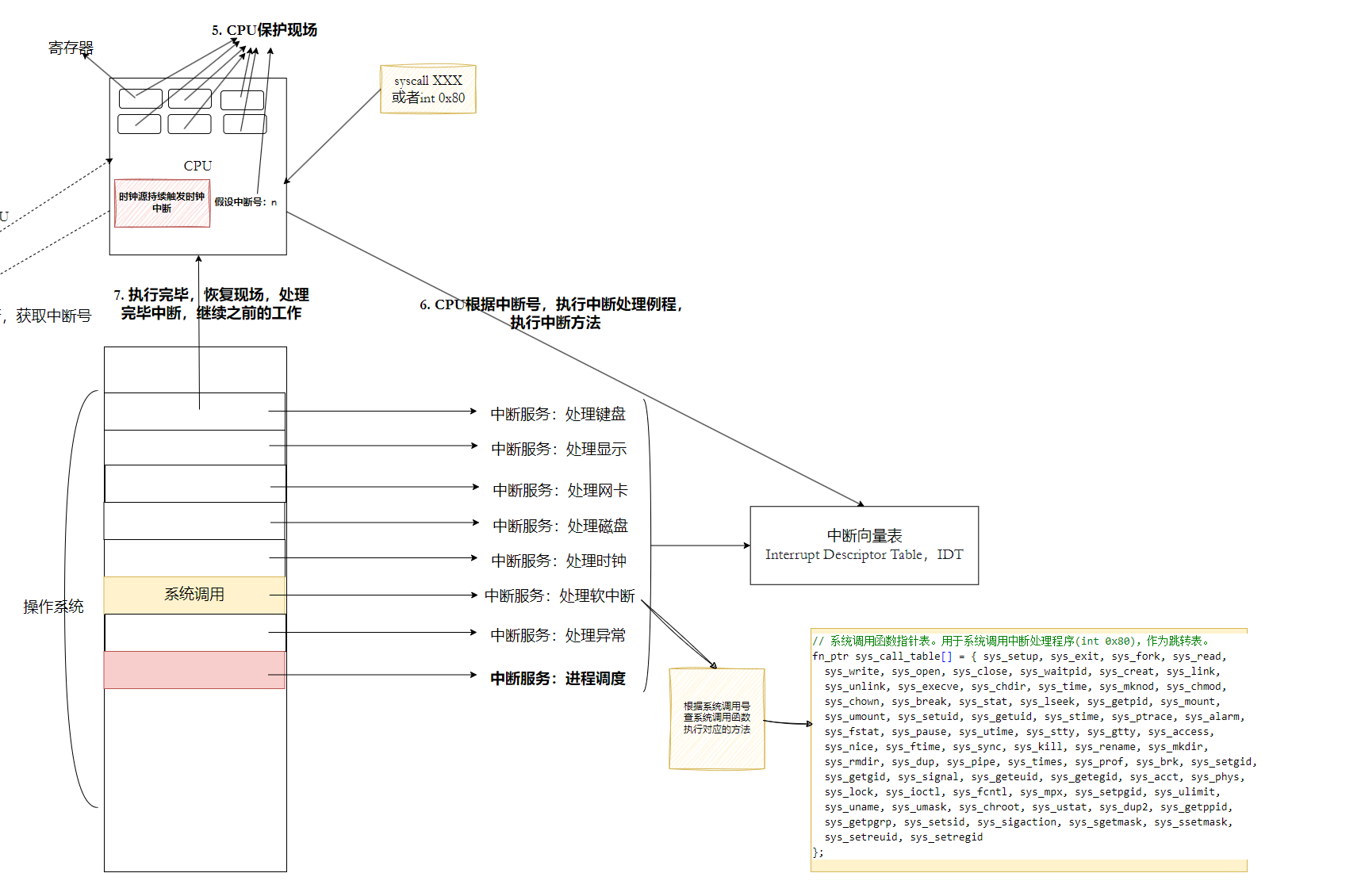 - 系统调⽤的过程,其实就是先int 0x80、syscall陷⼊内核,本质就是触发软中断,CPU就会⾃动执⾏系统调⽤的处理⽅法,⽽这个⽅法会根据系统调⽤号,⾃动查表,执⾏对应的⽅法
