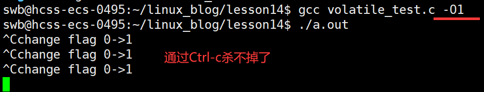 优化情况下,键⼊CTRL-C ,2号信号被捕捉,执⾏⾃定义动作,修改flag=1 ,但是while条件依旧满⾜,进程继续运⾏!但是很明显flag肯定已经被修改了,但是为何循环依旧执⾏?很明显,while 循环检查的flag,并不是内存中最新的flag,这就存在了数据⼆异性的问题。while 检测的flag其实已经因为优化,被放在了CPU寄存器当中。如何解决呢?很明显需要volatile。