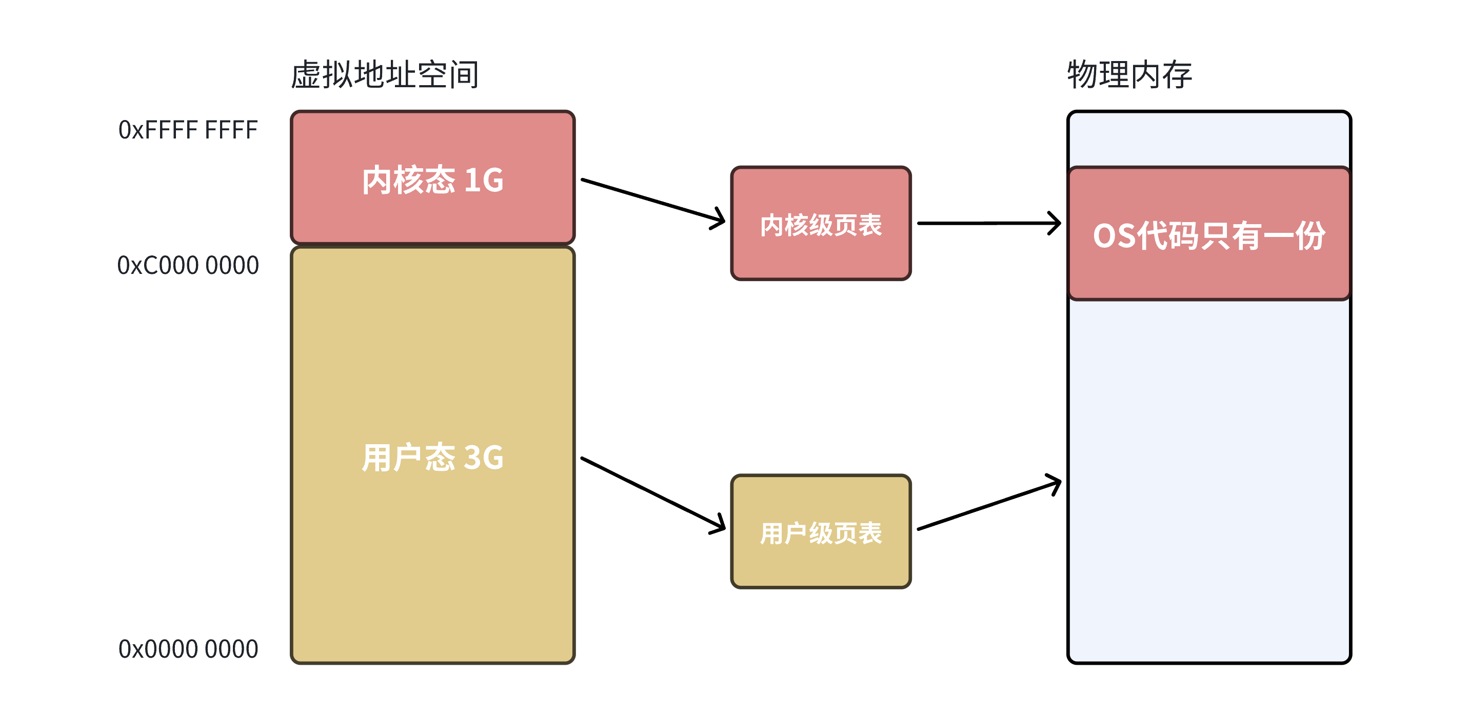 - ⽤⼾态:只能操作0-3G 范围的低位虚拟空间地址