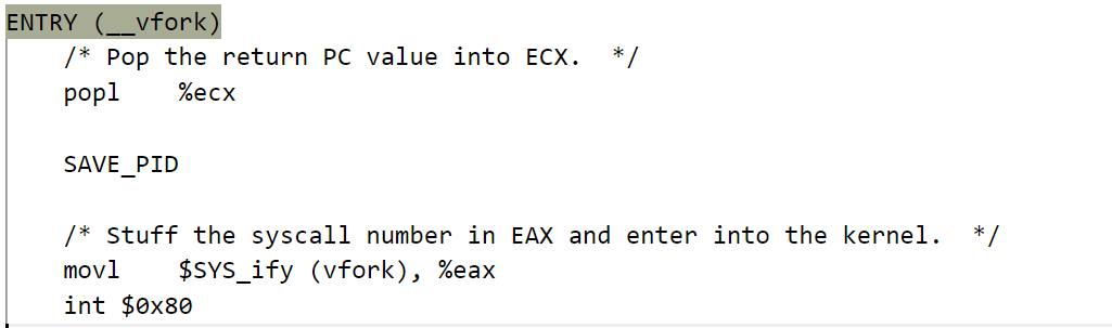 - 操作系统提供了中断指令int 0x80来主动进⼊内核,这是⽤⼾程序发起的调⽤访问内核代码的唯⼀⽅式。调⽤系统函数时会通过内联汇编代码插⼊int 0x80的中断指令,内核接收到int 0x80中断后,查询中断处理函数地址,随后进⼊系统调⽤。