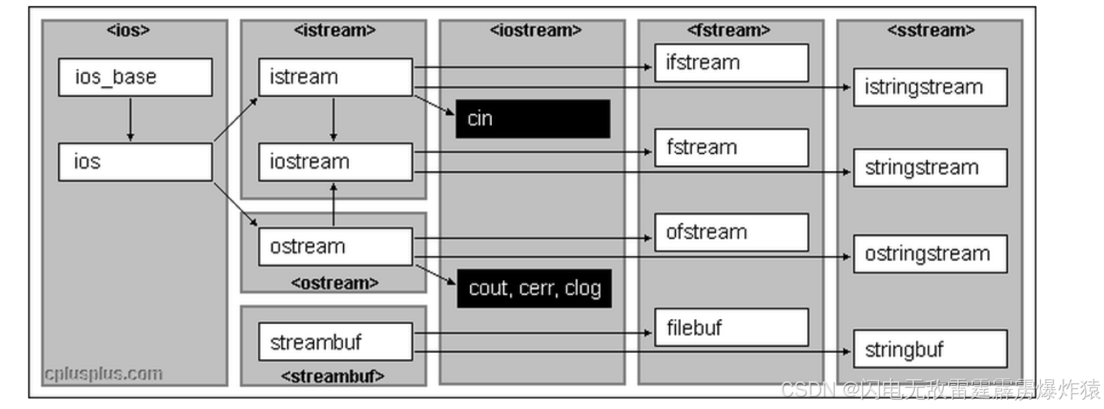 为了实现这种流动,C++定义了I/O标准类库,当中的每个类都称为流/流类,包括往字符串文件和标准输入输出设备进行IO的类库,以完成某方面的功能。
