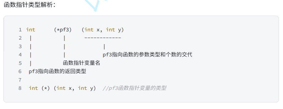 {int (*p)(int x, int y) = Add;int (*p1)(int, int) = Add;//上面两种写法都可以 都是函数指针,参数可以写实参名也可以不写实参名int a = (*p)(1, 2);int b = p(1, 2);int a1 = (*p1)(1, 2);int b1 = p1(1, 2);printf("%d %d\n", a, b);printf("%d %d\n", a1, b1);return 0;