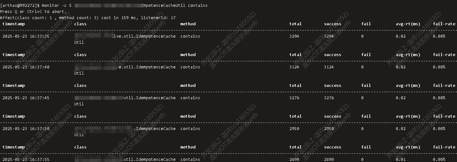 这个方案的好处是充分利用本地缓存,有几极致的性能表现, 使用arthas监控校验方法,每条数据校验仅耗时0.02毫秒,加上写入布隆过滤器和本地缓存耗时0.04毫秒,那么幂等性校验功能总共耗时0.06毫秒。