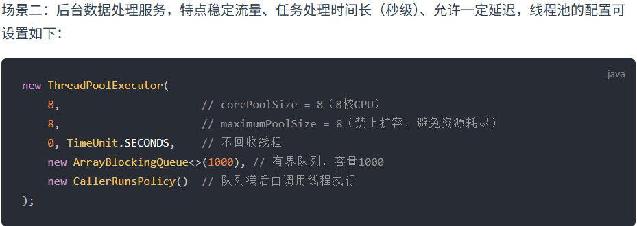 固定线程数避免资源波动,队列缓冲任务,拒绝策略兜底。