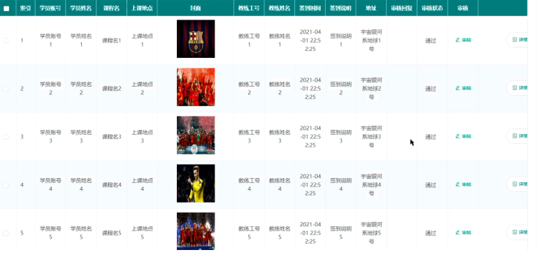 教练可查看学员课程签到信息,并可对其进行审核操作,课程签到管理界面展示如图5-15所示。