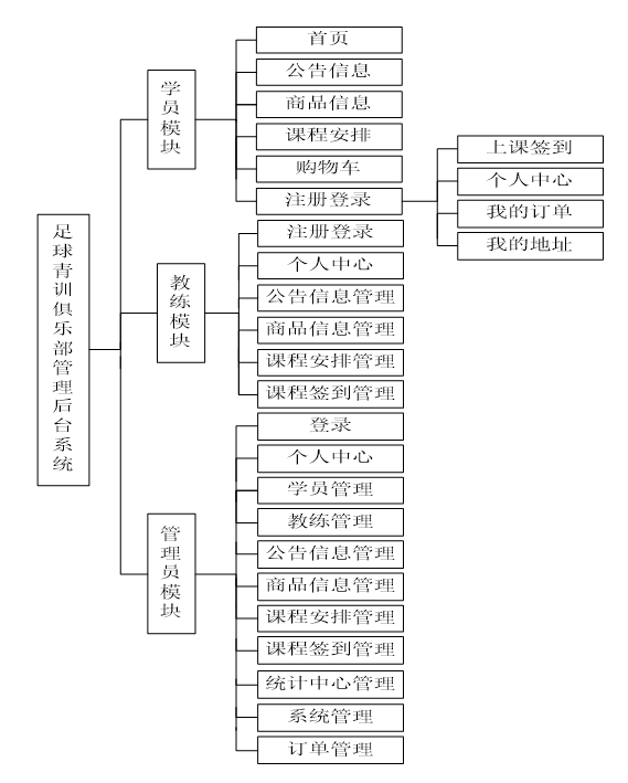 本基于Web的足球青训俱乐部管理后台系统由学员功能模块、教练功能模块和管理员功能模块三大部分构成,系统的结构图如图4-2所示。