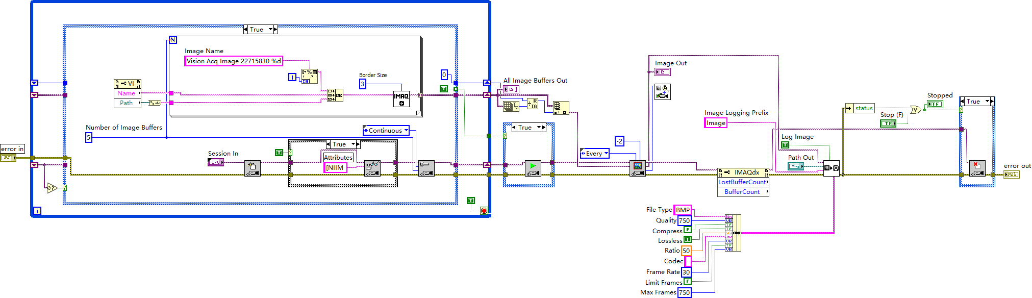该VI实现机器视觉图像的连续采集、缓冲区管理及图像日志记录,支持从相机(或图像源)获取图像流,经缓冲处理后按配置参数(如帧率、存储格式等)保存图像文件,适用于工业视觉检测、图像数据采集场景。