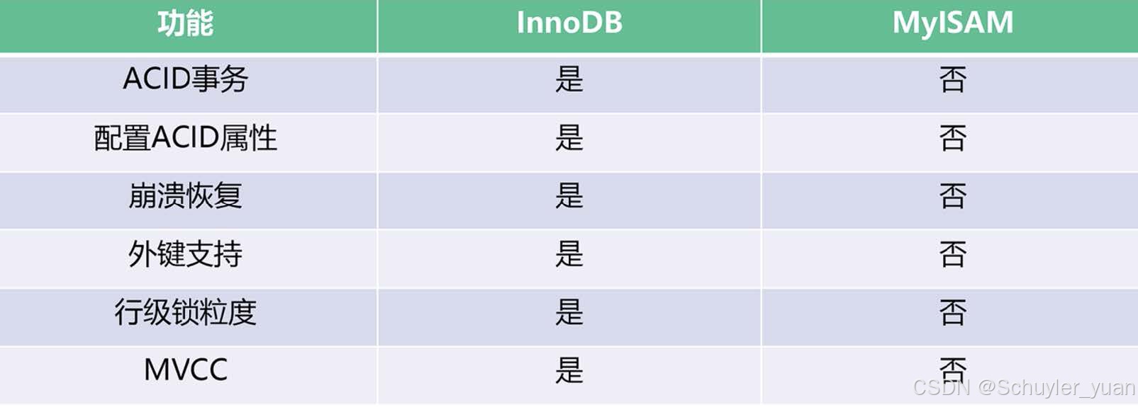 InnoDB 提供了具有提交、回滚和崩溃回复能力的事务安全,相比于 MyISAM,InnoDB 写的处理效率差一些,还会占用更多的磁盘空间来保留数据和索引,表级锁 / 行级锁。