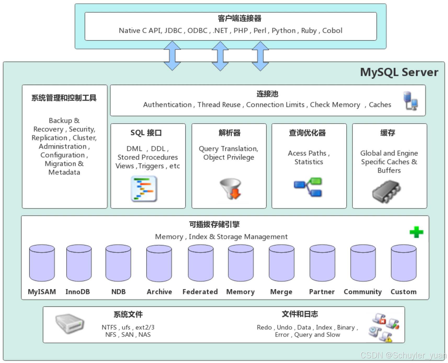 客户端连接部分 → MySQL Server部分 → Service & Utilities部分 → SQL处理所需要的模块 → MySQL所支持的各个存储引擎 → 物理存储层