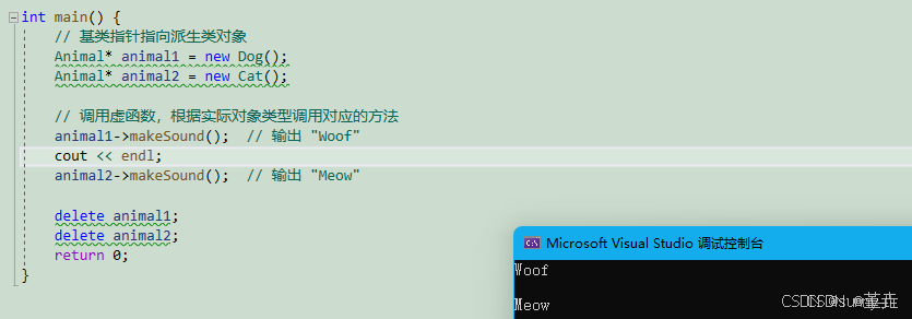 };int main() {// 基类指针指向派生类对象Animal* animal1 = new Dog();Animal* animal2 = new Cat();// 调用虚函数,根据实际对象类型调用对应的方法animal1->makeSound(); // 输出 "Woof"animal2->makeSound(); // 输出 "Meow"delete animal1;delete animal2;return 0;