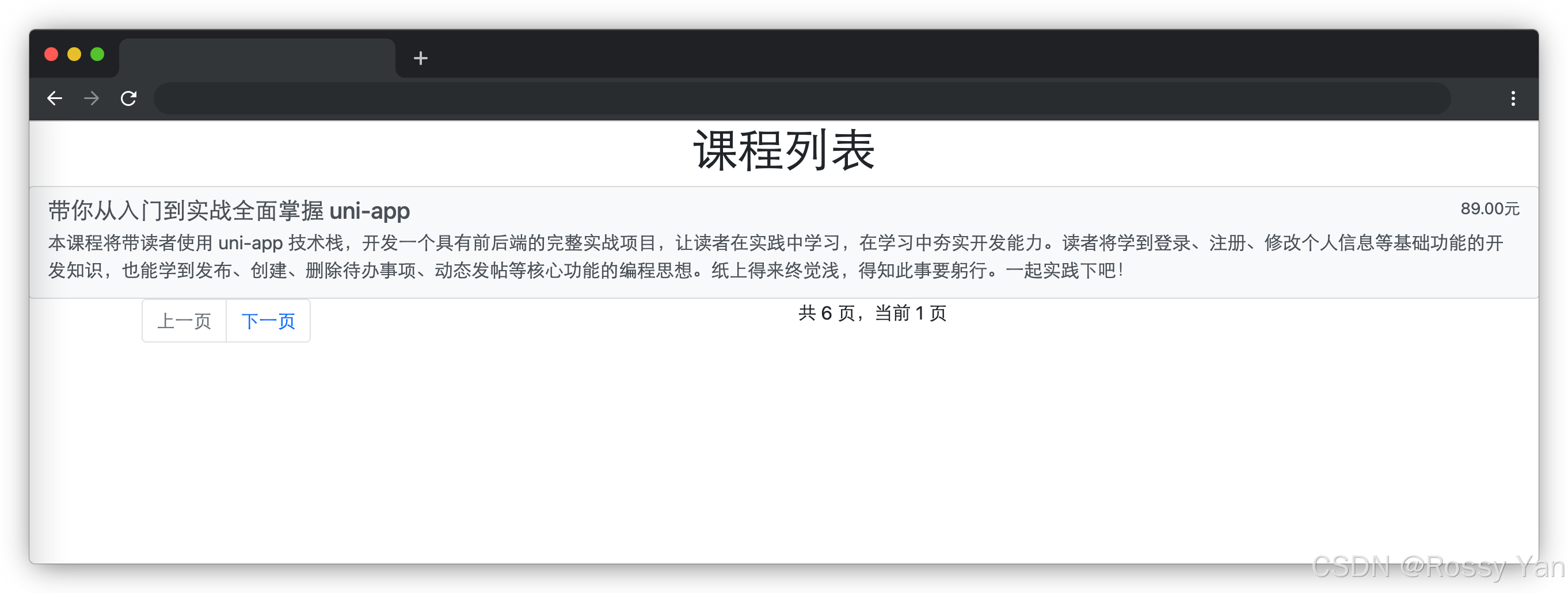 id为list的div元素,用于动态渲染课程列表。- 有一个分页导航栏,包含 “上一页” 和 “下一页” 按钮,还有一个