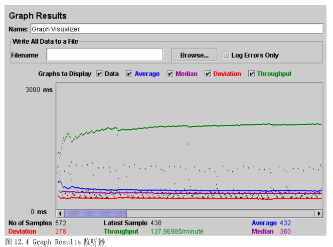 图 12.3. JMS Publisher 12.3 添加一个监听器浏览/保存测试结果 你需要添加到你测试计划的最后元件是一个监听器。这个元件责任是储存所有你的 HTTP 请求结果到文件,并且展示一个可视数据模型。 选择 Jakarta Users 元件,添加一个 Graph R Resultsr 监听器(Add - --> Listener --> G Graph Results)。 Next, you need to specify a directory and filename of the output file. You can either type it into the filename field, or select the Browse button and browse to a directory and then enter a filename.