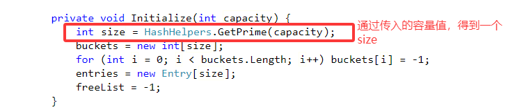 通过HashHelpers.GetPrime得到一个新的值,作为哈希桶和键值对数组的容量,代码如下: