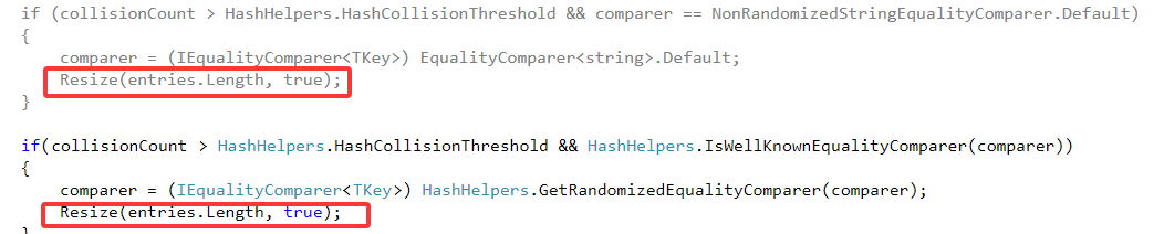 2.字典中的哈希冲突的数量已达到阈值:传入新的容量的是entries当前长度,并强制更新hashcode。